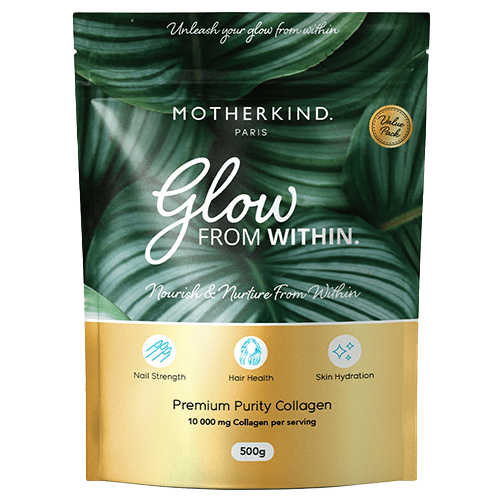 Motherkind Glow From Within is premium pure hydrolysate collagen peptides. Collagen makes up 70% of your dermis, therefore, providing your body with collagen may help maintain a healthy dermis in order to prevent thinning of hair and to rejuvenate hair loss. In addition it plays a role in strengthening skin, plus may benefit both elasticity and hydration. Glow From within Collagen supports integrity of our cartilage, supports in tightening, strengthening and toning the entire digestive system, and supports our sleep quality.