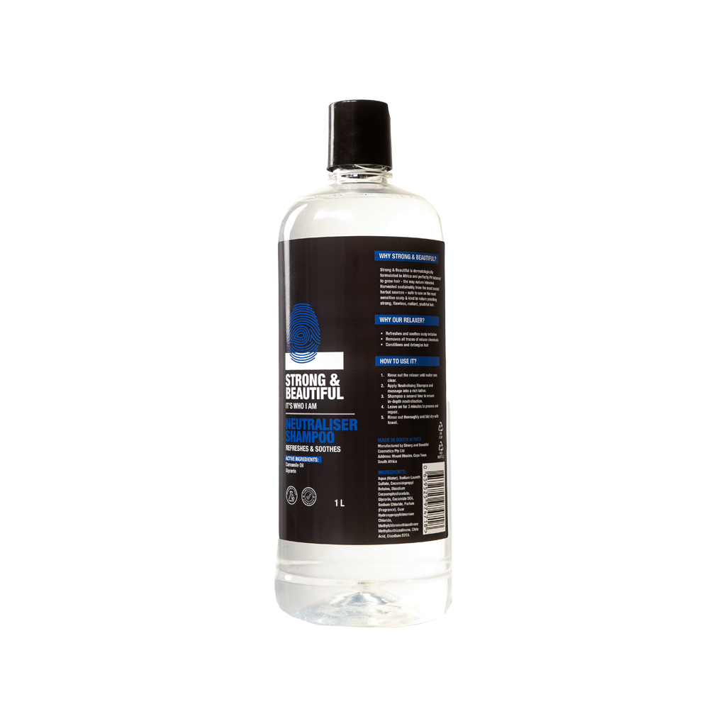 The Strong & Beautiful Neutraliser Shampoo in a generous 1L size is an essential part of your hair care regimen, specifically designed to neutralize and condition your hair after using a relaxer. This high-performance shampoo effectively relieves scalp irritation, removes all traces of relaxer chemicals, and leaves your hair conditioned and detangled. Infused with nourishing ingredients like Glycerin, Citric Acid, and Chamomile Oil, this neutralizing shampoo ensures your hair remains healthy, balanced, and beautifully smooth.