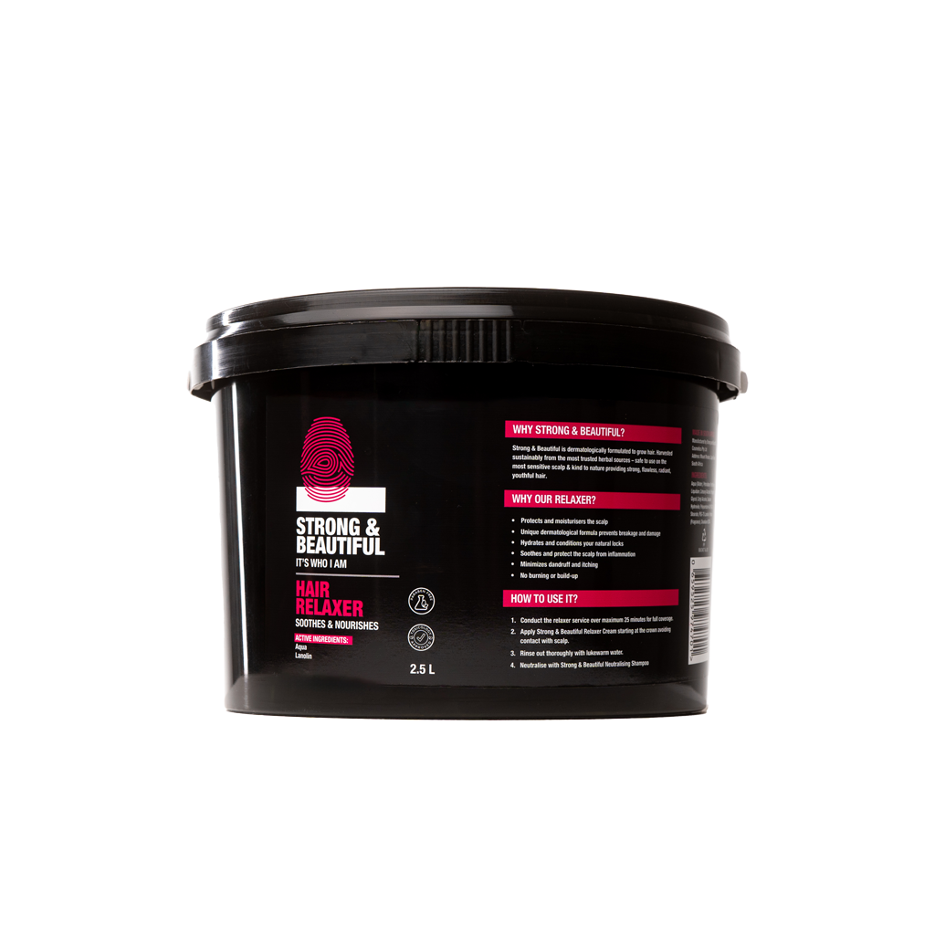 Achieve smooth, manageable hair with the Strong & Beautiful Hair Relaxer Tub, available in a substantial 2.5KG size for extended use. This hair relaxer is expertly formulated to protect and moisturize the scalp while effectively relaxing and straightening natural hair. Its unique dermatological formula minimizes breakage and damage, hydrates and conditions your locks, and soothes the scalp to prevent inflammation. Infused with key ingredients like Lanolin, this relaxer ensures your hair remains healthy, shiny, and beautifully relaxed.